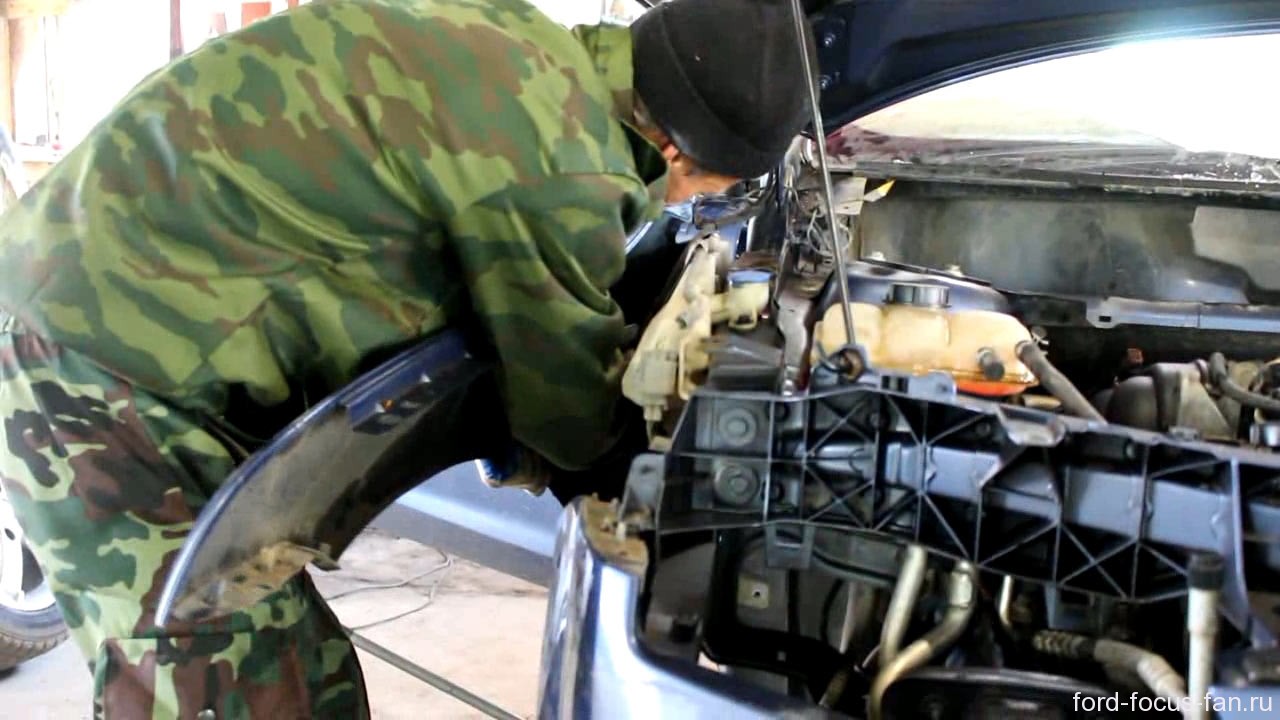 Произведем разборку салона автомобиля и внешнюю разборку. Для того, чтобы получить доступ ко всем деформированным деталям и просто для того, чтобы не повредить и не испачкать элементы салона. А также снимем фары, передние бампер и крыло (для починки), решетку и рамку радиатора и пластмассовые элементы отделки подкапотного отсека.