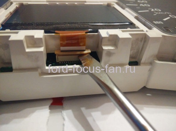 Теперь чтобы снять саму плату придется немного попотеть, так как она плотно закреплена на беленьких штырьках. Важно очень аккуратно пытаться снять плату иначе трещина и на помойку. Я снимал с помощью тонкого ножа, упирая его как можно ближе к крепежному штырю.