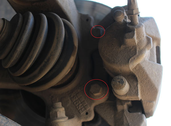 Ослабляем болты на колесах и ступичные гайки. Поднимаем переднюю часть автомобиля. При этом крайне важно четко ее зафиксировать. Снимаем колеса, полностью сняв болты крепления и откручиваем гайки на ступице. Откручиваем гайку пальца шаровой опоры. Сделайте макет местоположения болтов и пометьте их крепления к шаровой на рычаге подвески, обведя вокруг них маркером.